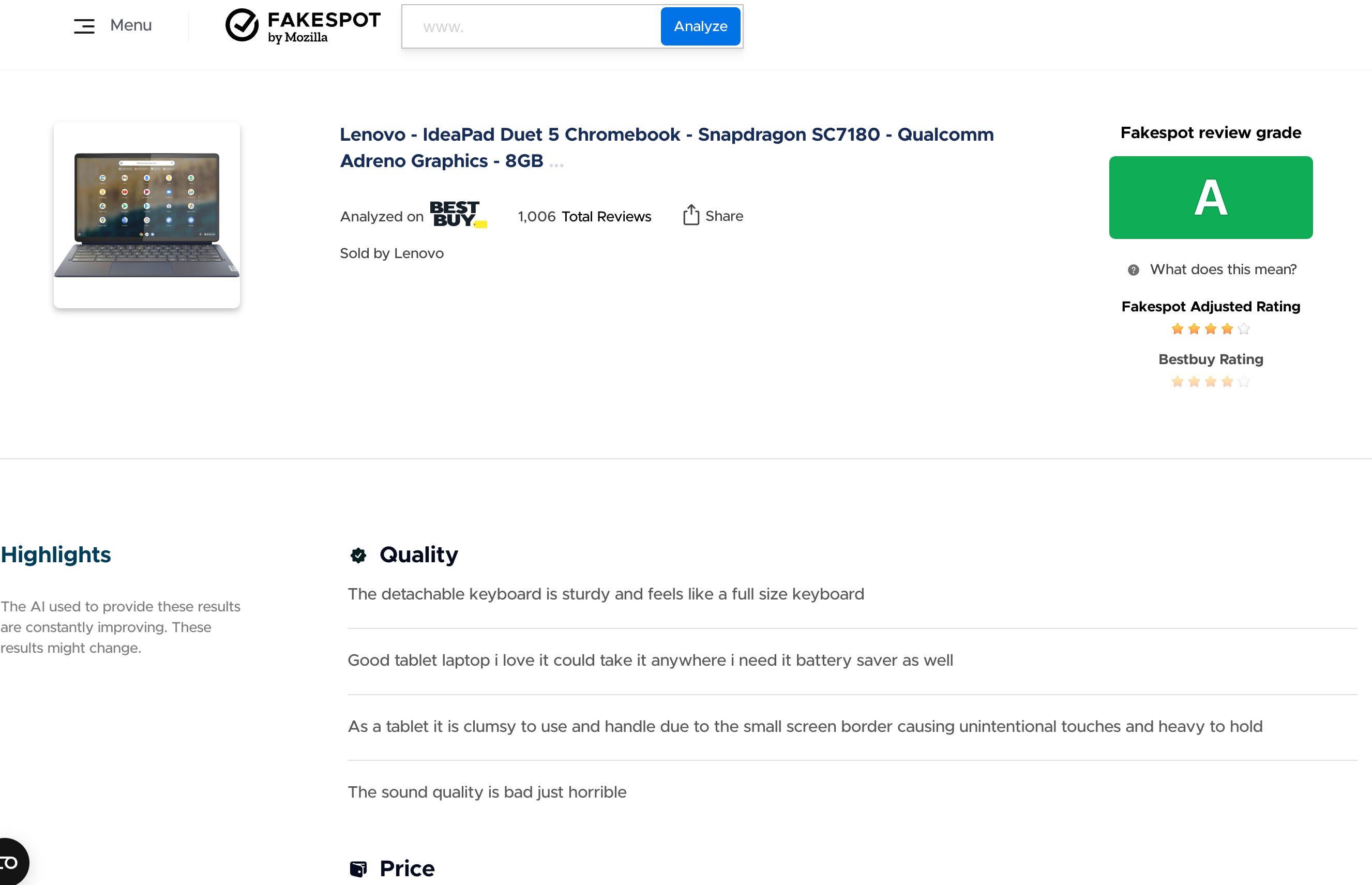 Grading System: After analyzing the reviews, Fakespot assigns a grade from A to F. An “A” grade indicates that the reviews are highly likely to be genuine, while an “F” suggests that a significant portion of the reviews are likely fake. This grading system applies both to individual products and sellers.
